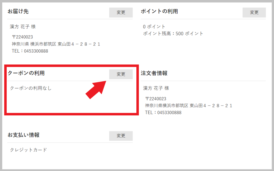 ※「ご注文の確認」画面へ移動された方は、「クーポンの利用」の「変更」ボタンを押し、「ご注文方法の指定」画面に移動した後、