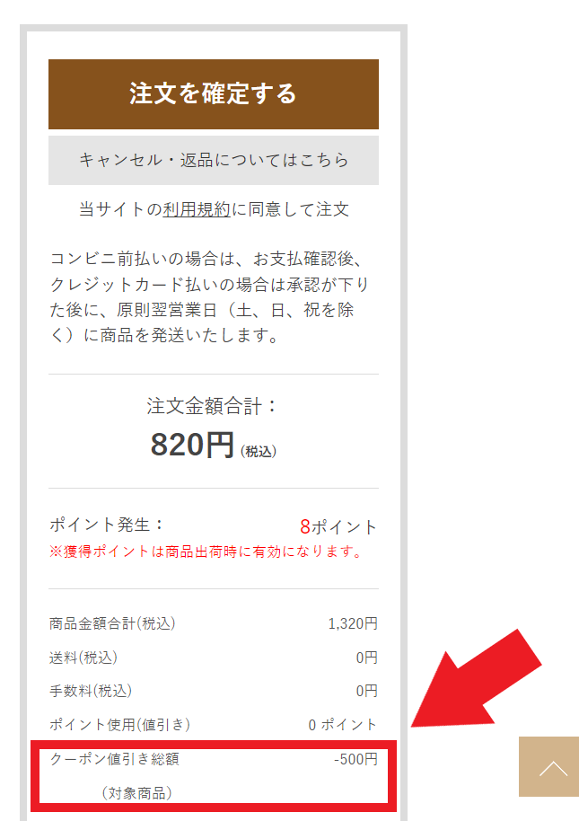 ⑧最後に、「注文を確定する」のボタンを押す前に、下部にあるクーポン値引き総額でクーポンが適用されていることを